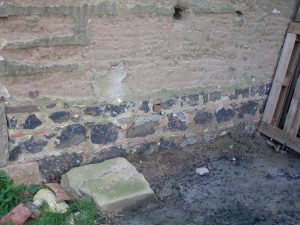 ci-contre: utilisation de blocs minéralisés pour le sous-bassement d’un mur à Romanèche: