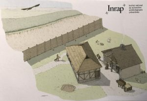 Evocation de la zone de forge avec, à proximité, la possible habitation du forgeron et les fortifications de terre et de bois.