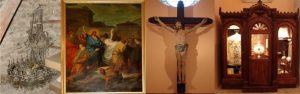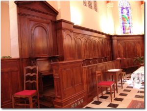 Le confessionnal transformé en vitrine vaut le détour. De nombreux éléments ayant servi aux offices y sont regroupés. En effet, on trouve dans la partie gauche une chasuble brodée du XIXème siècle; dans celle du milieu, un encensoir en bronze argenté du XIXème siècle, un ostensoir, une lunule (petite boîte contenant l’hostie consacrée), des chandeliers en bronze doré datant du XVIIème siècle et enfin, dans la partie droite, on note un ciboire et un calice argentés du XIXème siècle.