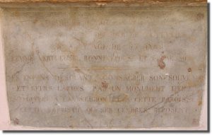 « À la mémoire de M. C. Joséphine Daby, veuve Labruyère, décédée le 26 février 1841 (57 ans), femme vertueuse, bonne épouse. Ses enfants désirant consacrer son souvenir et leurs larmes par un monument utile ont offert à la religion et à cette paroisse cette sacristie où ses cendres reposent ».