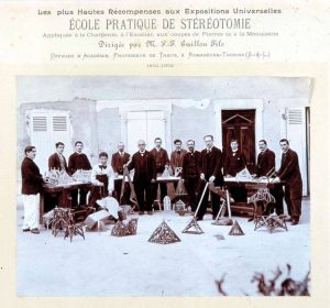 Fondée en 1871, l’école de tracé de charpente de Romanèche-Thorins (appelée Ecole professionnelle pratique de stéréotomie appliquée à la construction, plus connue sous le nom d’École de Trait) bénéficiait d’une importante renommée en France. Son fondateur, Pierre-François Guillon, compagnon charpentier, du Devoir de Liberté, transmettait à ses élèves un enseignement en dessin, découpe des matériaux et techniques des métiers du bois.